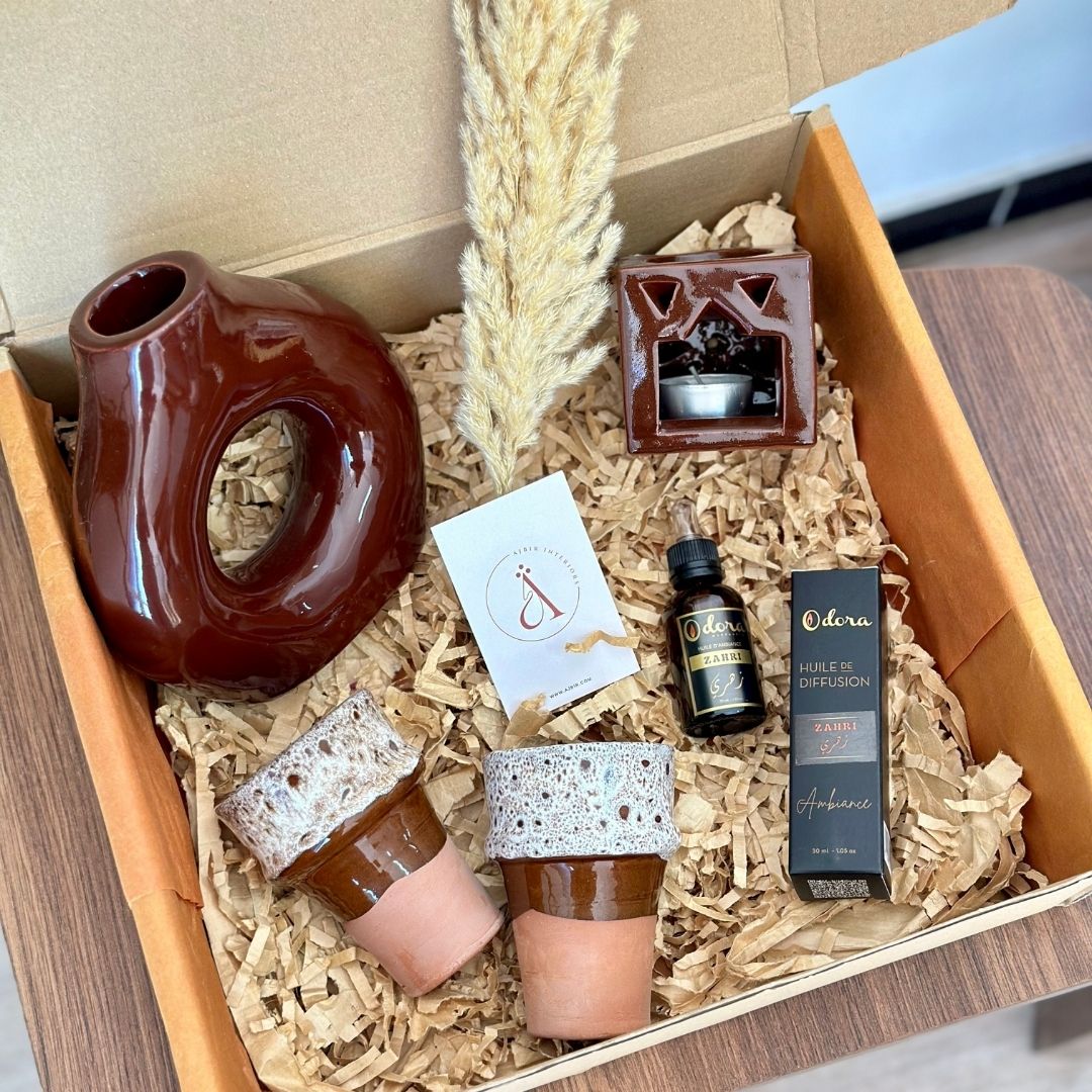 The Adrar Gift Box is a true Moroccan artisanal treasure, including a vase, two glasses, a charming diffuser with the Zahri (orange blossom) fragrance, and a pampas grass. Each piece is meticulously handcrafted by local artisans. Give a unique and charming gift.