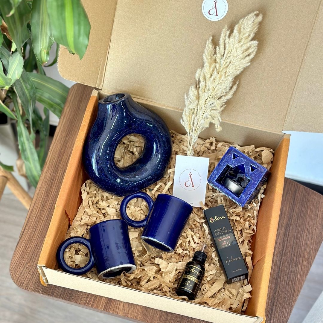 Give an Aghbalou gift set including a vase, two mugs, a diffuser, a pampas grass, and Moulay oil burner. These items, handmade by Moroccan artisans, will add a touch of authenticity to your home decor. Perfect as a gift or to treat yourself.