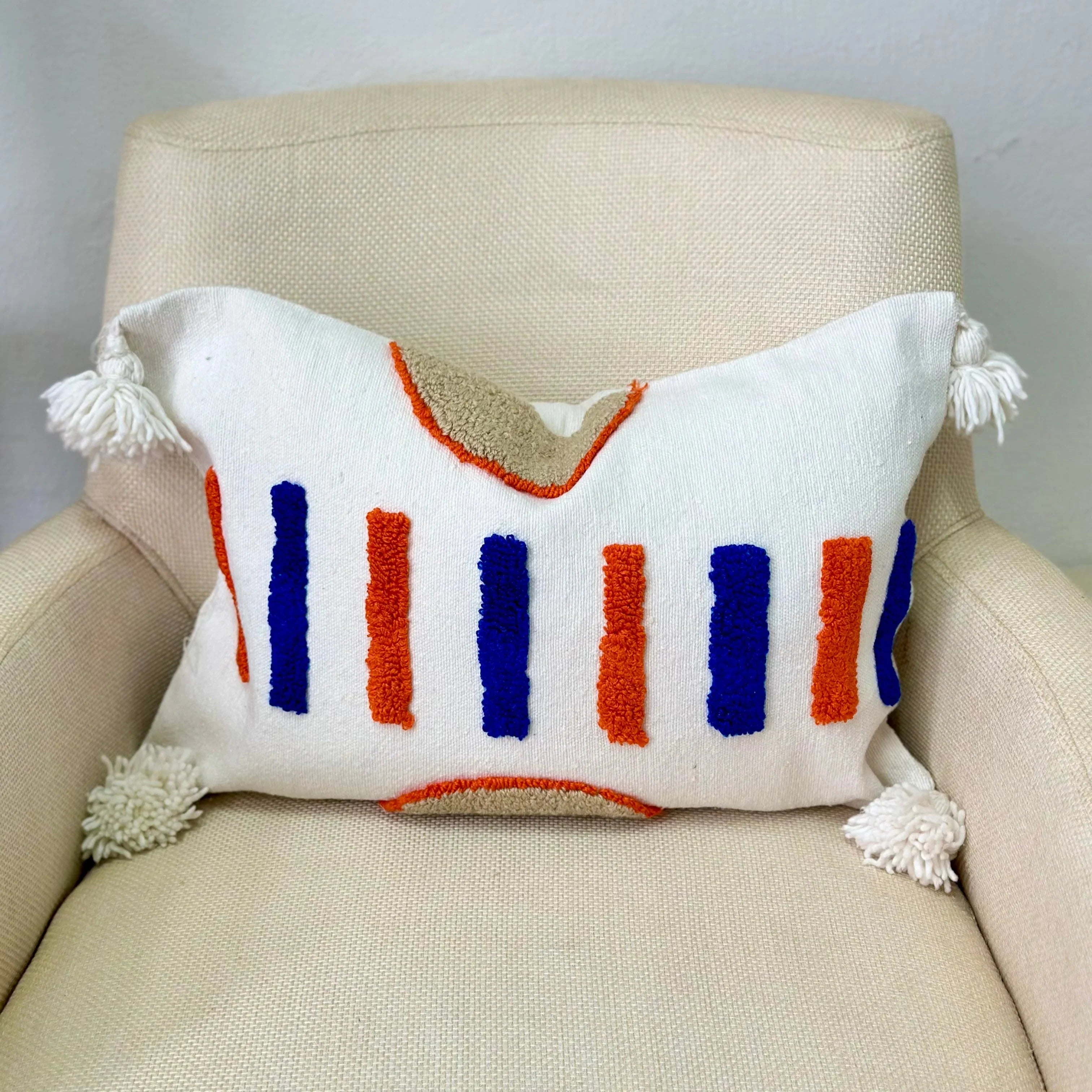 A cushion cover in thick cotton, decorated with raised geometric Berber patterns in shades of sand, orange, and blue, with white pompoms for a handcrafted finish.