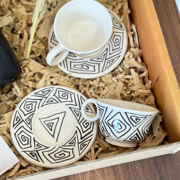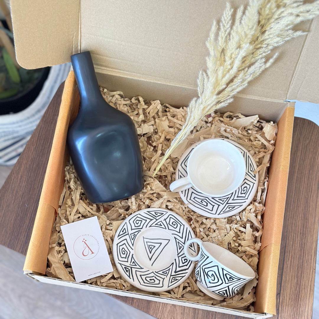 Give a unique experience with our Tit Noir gift box. Comprising a vase, two cups with saucers, and a pampas grass, this box showcases Moroccan craftsmanship. Transform your home with these unique pieces for an elegant and authentic look.