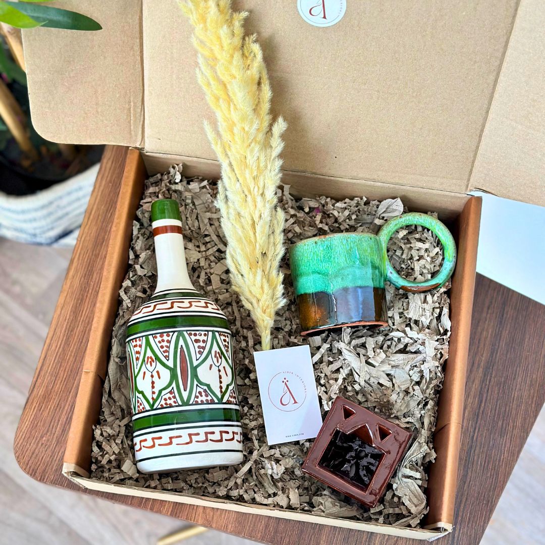 Discover the green and brown handcrafted gift set, a harmonious ensemble that showcases Moroccan craftsmanship and its natural hues. This unique set includes: