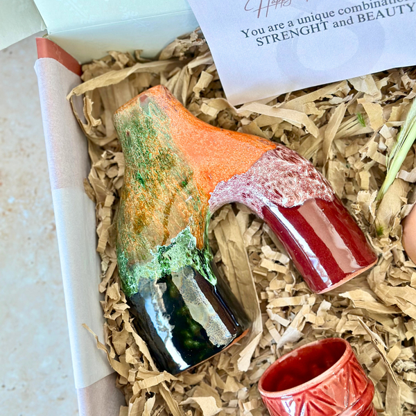 - 2 Burgundy Imprint Mugs: Handmade, these authentic mugs feature unique patterns in burgundy shades, ideal for enjoying your hot drinks in a warm atmosphere.