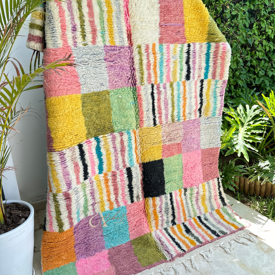 Discover the magnificent Moroccan Berber Azilal rug, a pure wool creation with colorful patterns. Inspired by the region, where this artisanal know-how has been passed down from generation to generation, each piece is a unique creation, entirely handmade.