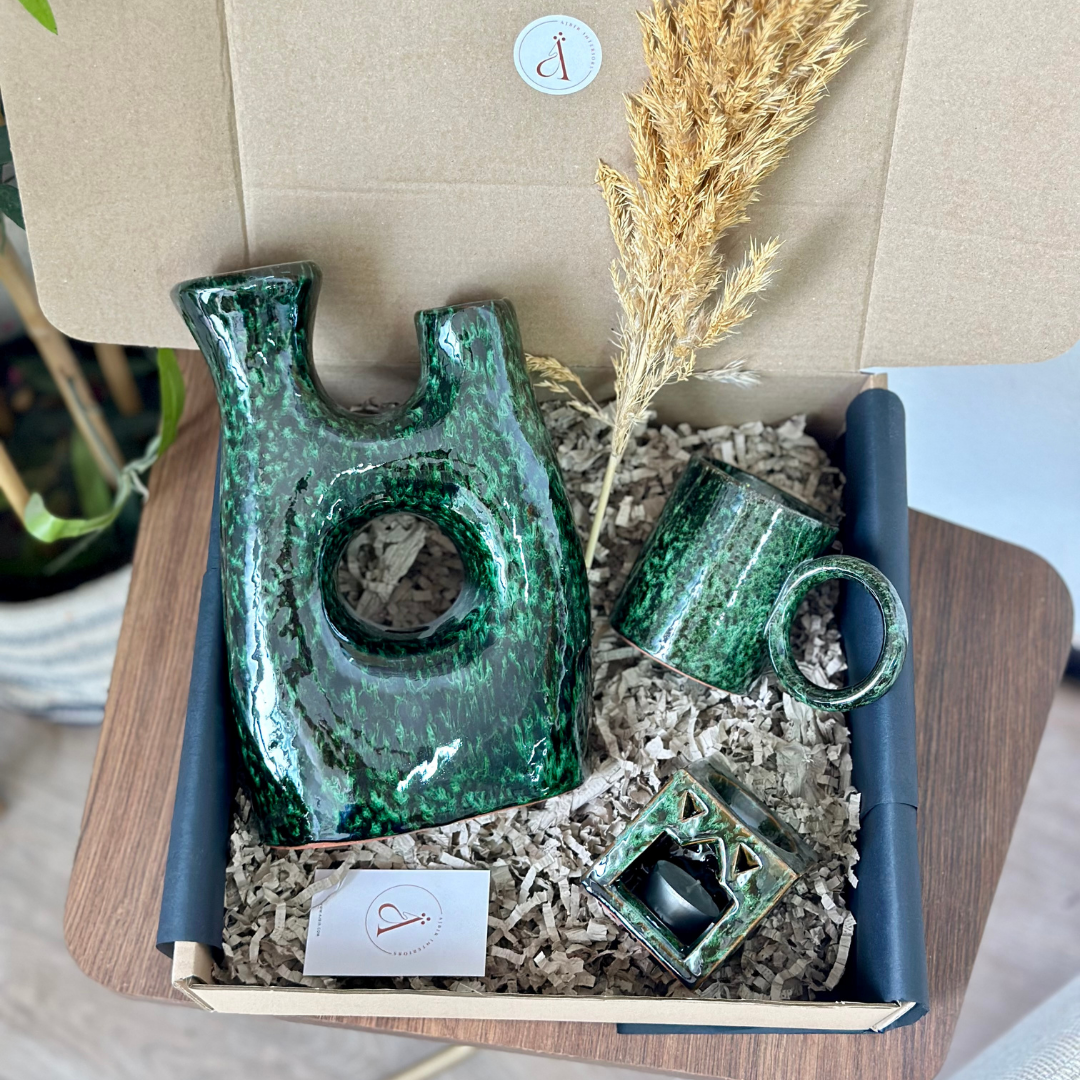 This green Tagdourt gift box is the ultimate gift for lovers of handmade decor. Comprising a vase, a mug, a diffuser, and a pampas grass, each piece is carefully handcrafted. Give a unique and personal gift with this lovingly crafted gift box.