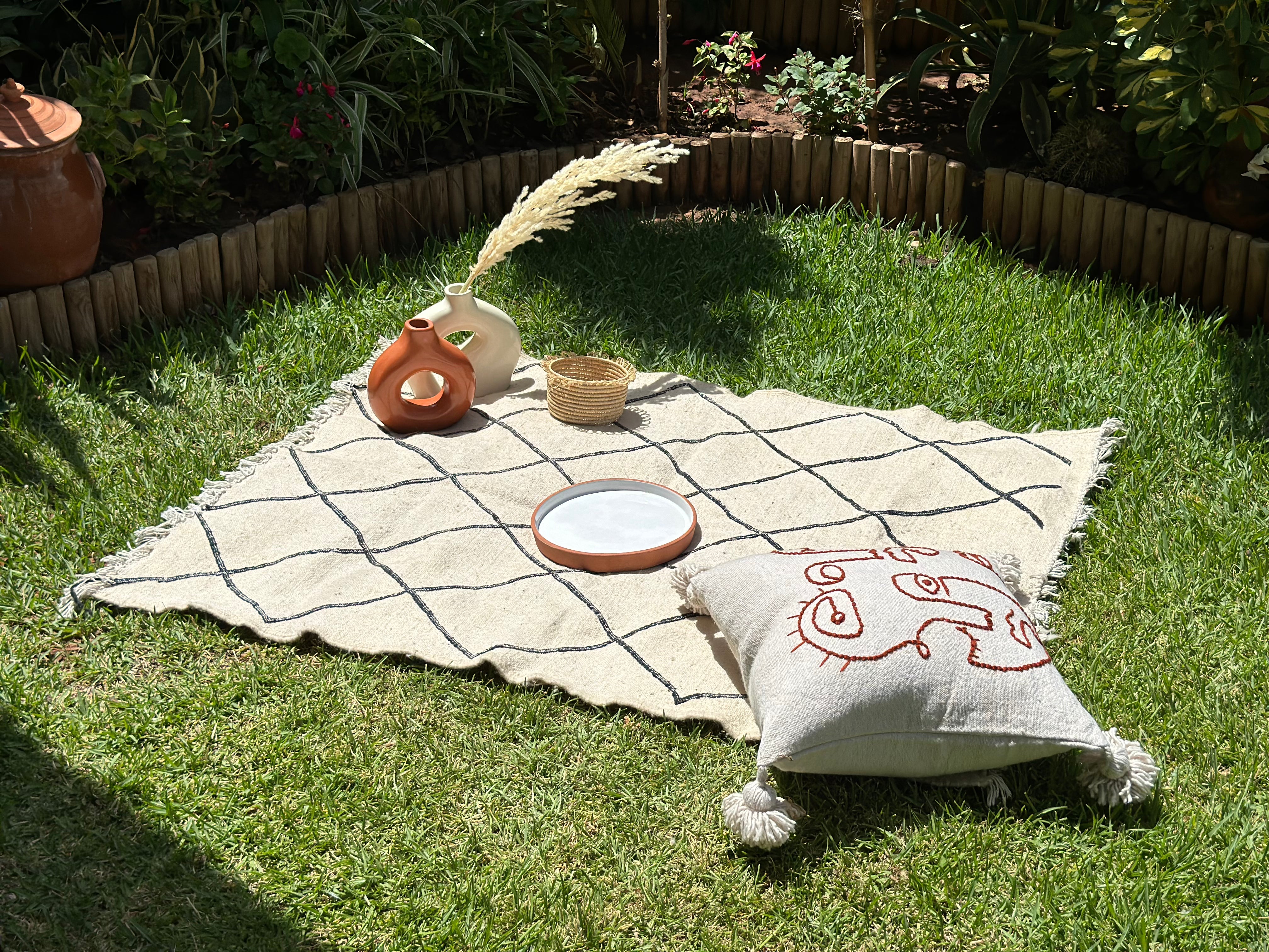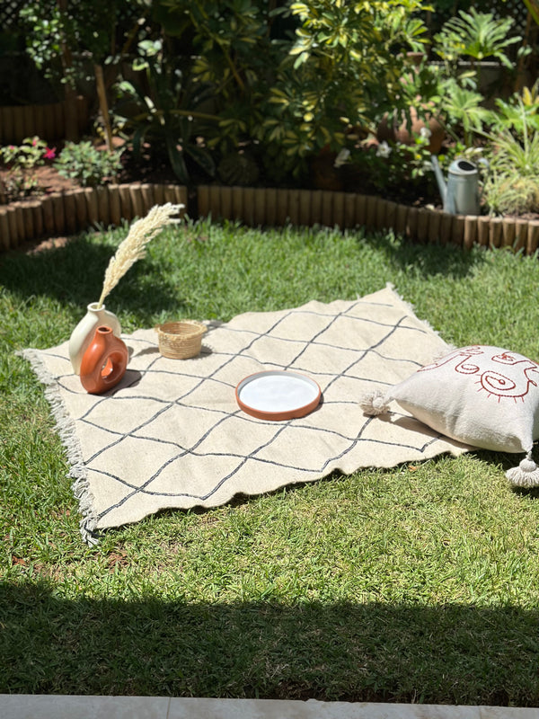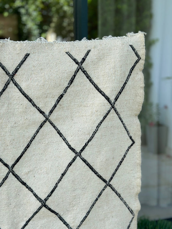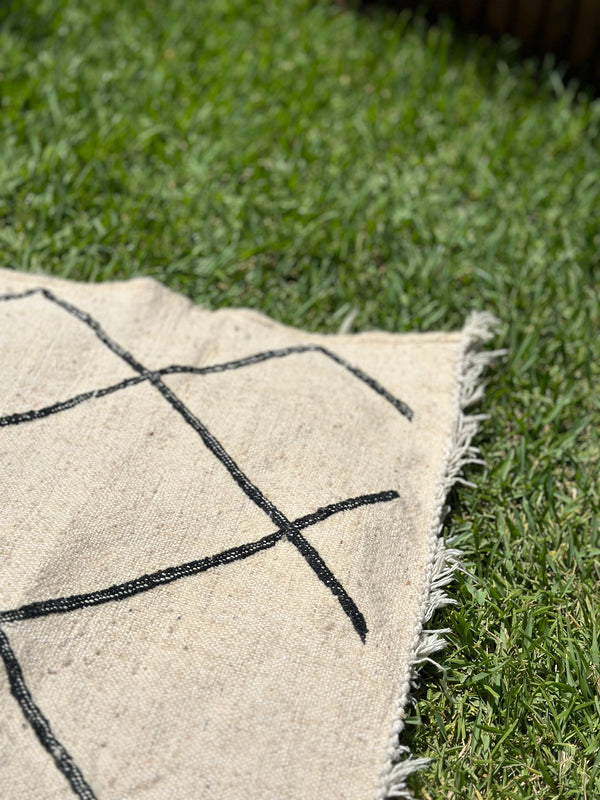 The Hanbal cotton rug measuring 133cm/103cm cm is an authentic piece of Moroccan craftsmanship, hand-woven using ancestral techniques. Its carefully crafted black diamond pattern reflects the cultural heritage of Morocco's Berber tribes. The use of cotton guarantees both softness and durability, while the fine weave gives the rug a timeless elegance. This Hanbal rug blends perfectly into a modern or classic interior, adding a touch of authenticity and artisanal character.