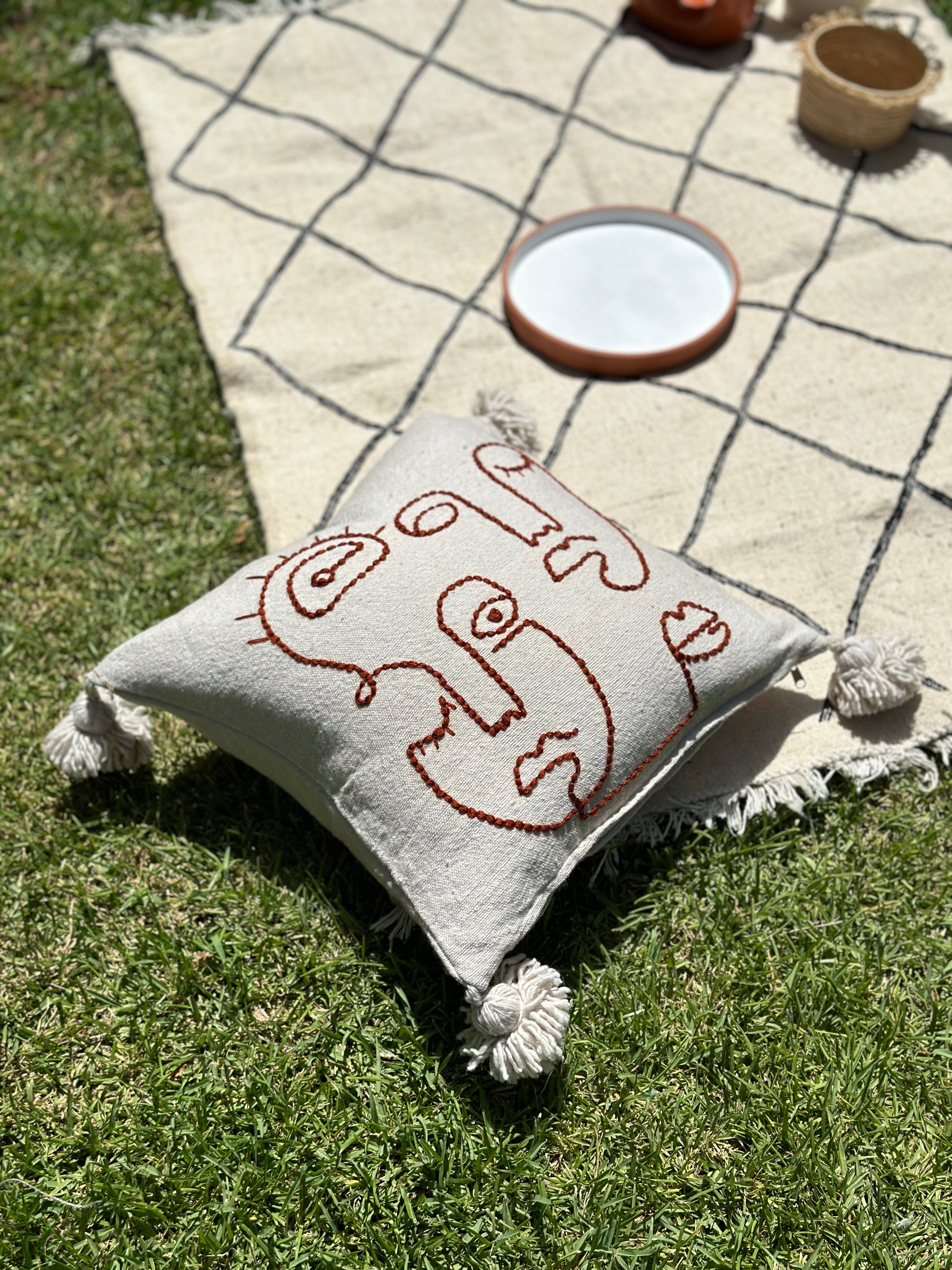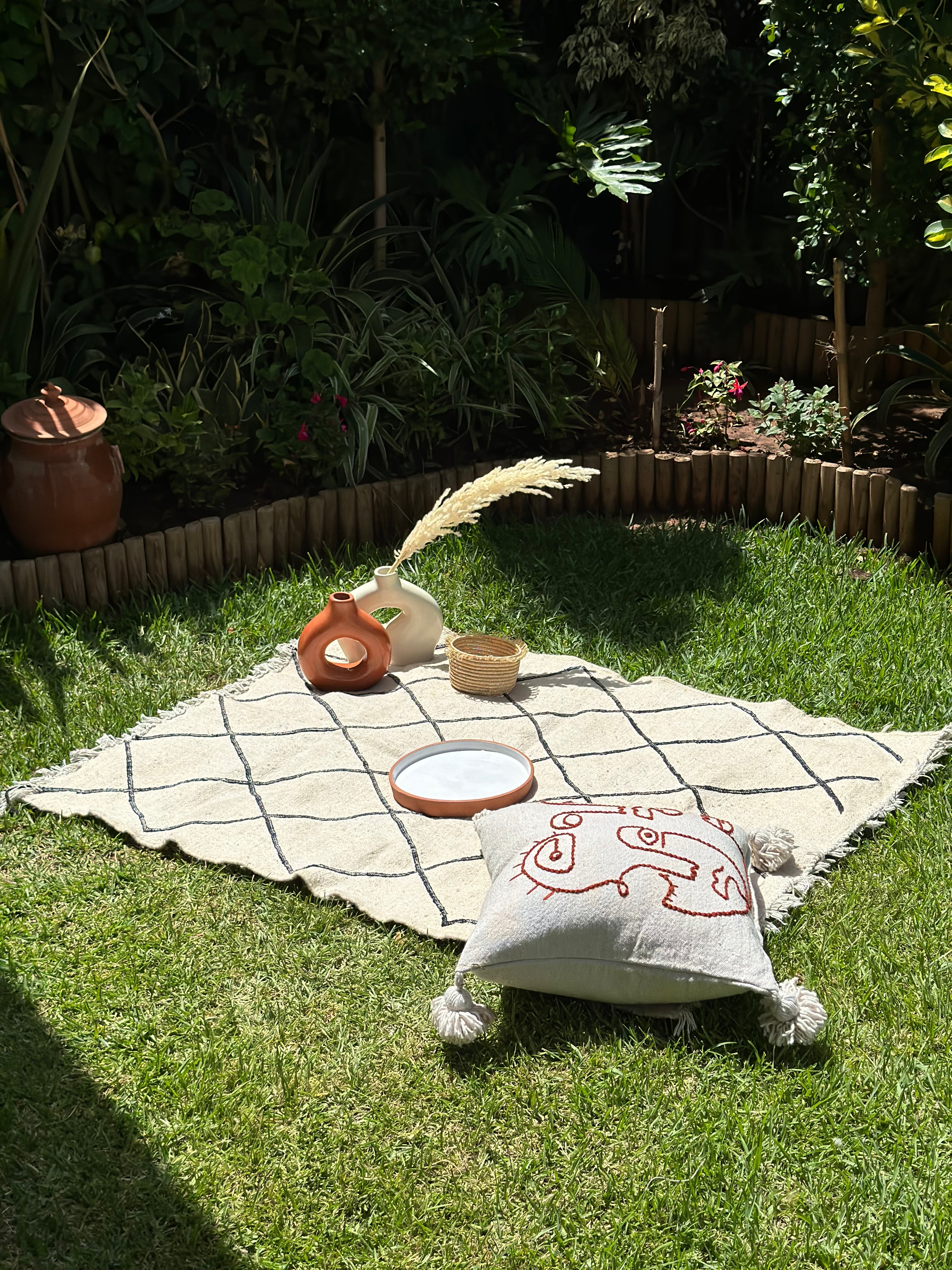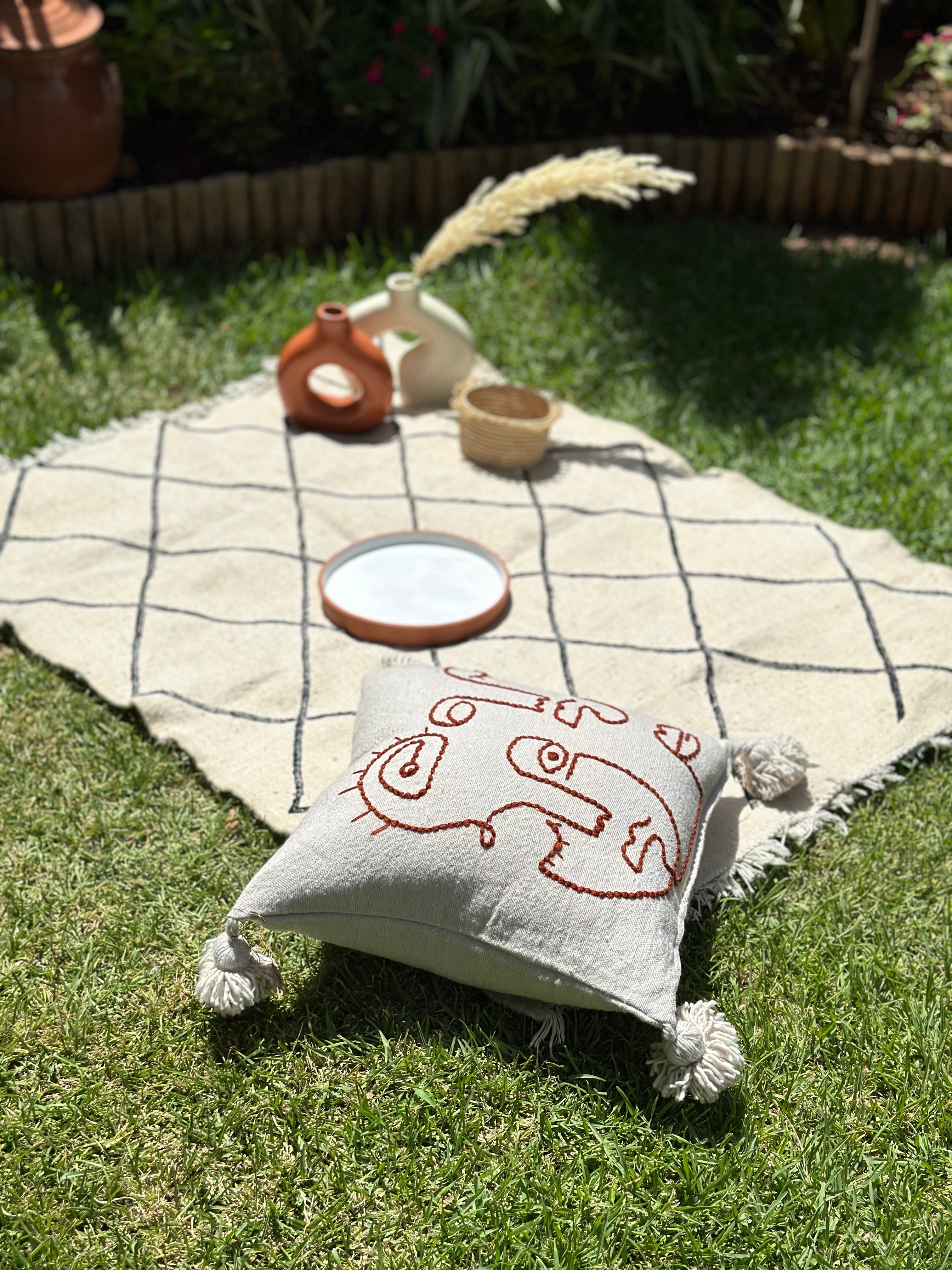 The Hanbal cotton rug measuring 133cm/103cm cm is an authentic piece of Moroccan craftsmanship, hand-woven using ancestral techniques. Its carefully crafted black diamond pattern reflects the cultural heritage of Morocco's Berber tribes. The use of cotton guarantees both softness and durability, while the fine weave gives the rug a timeless elegance. This Hanbal rug blends perfectly into a modern or classic interior, adding a touch of authenticity and artisanal character.