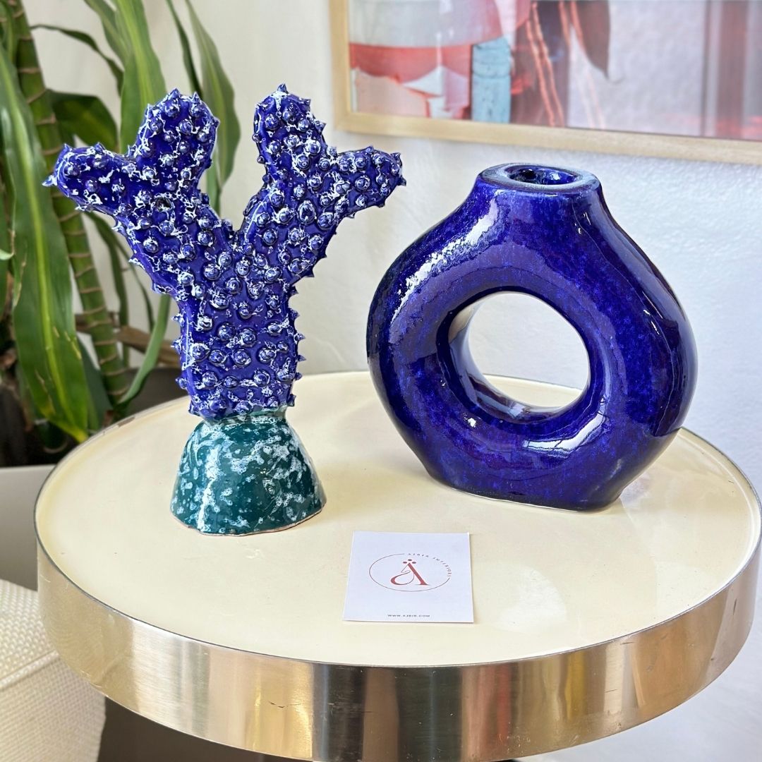 This unique deco pack consists of a blue cactus and a blue tafoukt vase handmade by Moroccan artisans. Add a touch of authentic craftsmanship to your interior with these unique and colorful pieces. Handmade with care, this pack will bring an original touch to your decoration.
