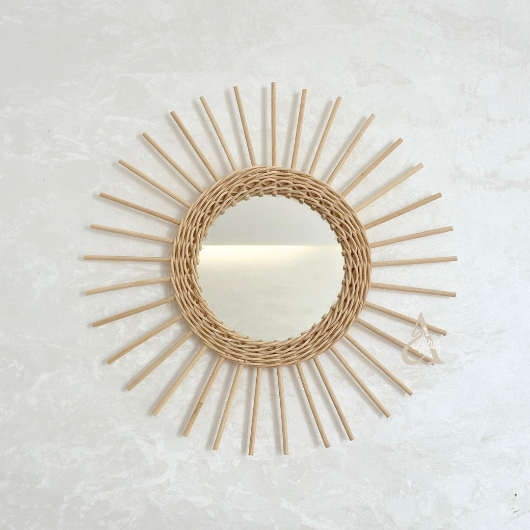 This wall mirror is handmade from rattan and natural wood by Moroccan artisans. Its sun-inspired design, with braided rays and slender rods, brings a warm, boho-chic, and elegant touch to your decor.