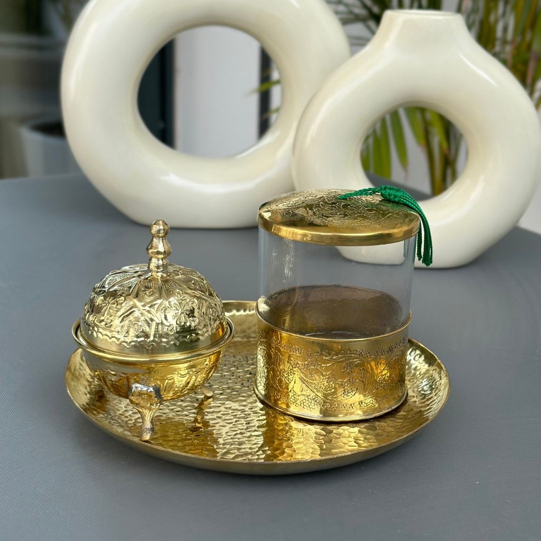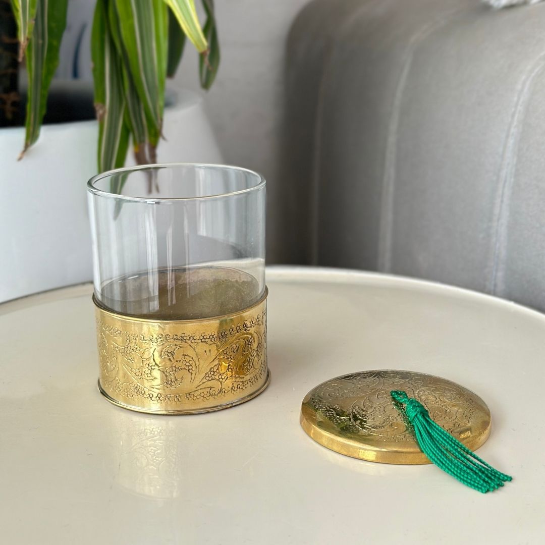 Brass, a unique Moroccan handcrafted piece. This sugar bowl combines the delicate transparency of glass with the warm shine of gilded brass, creating an object that is both functional and decorative. Ideal for your convivial moments, it fits perfectly into oriental, bohemian chic, or refined contemporary decor.