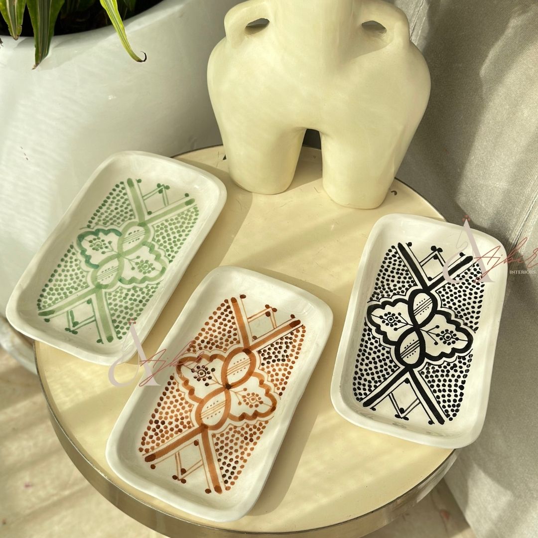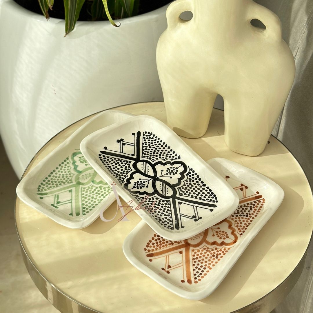 Discover the Taddart Green Tray, adorned with a traditional Moroccan motif hand-painted on high-quality white ceramic. Enhance your interior decor with this unique and refined piece that will speak to your artistic soul!